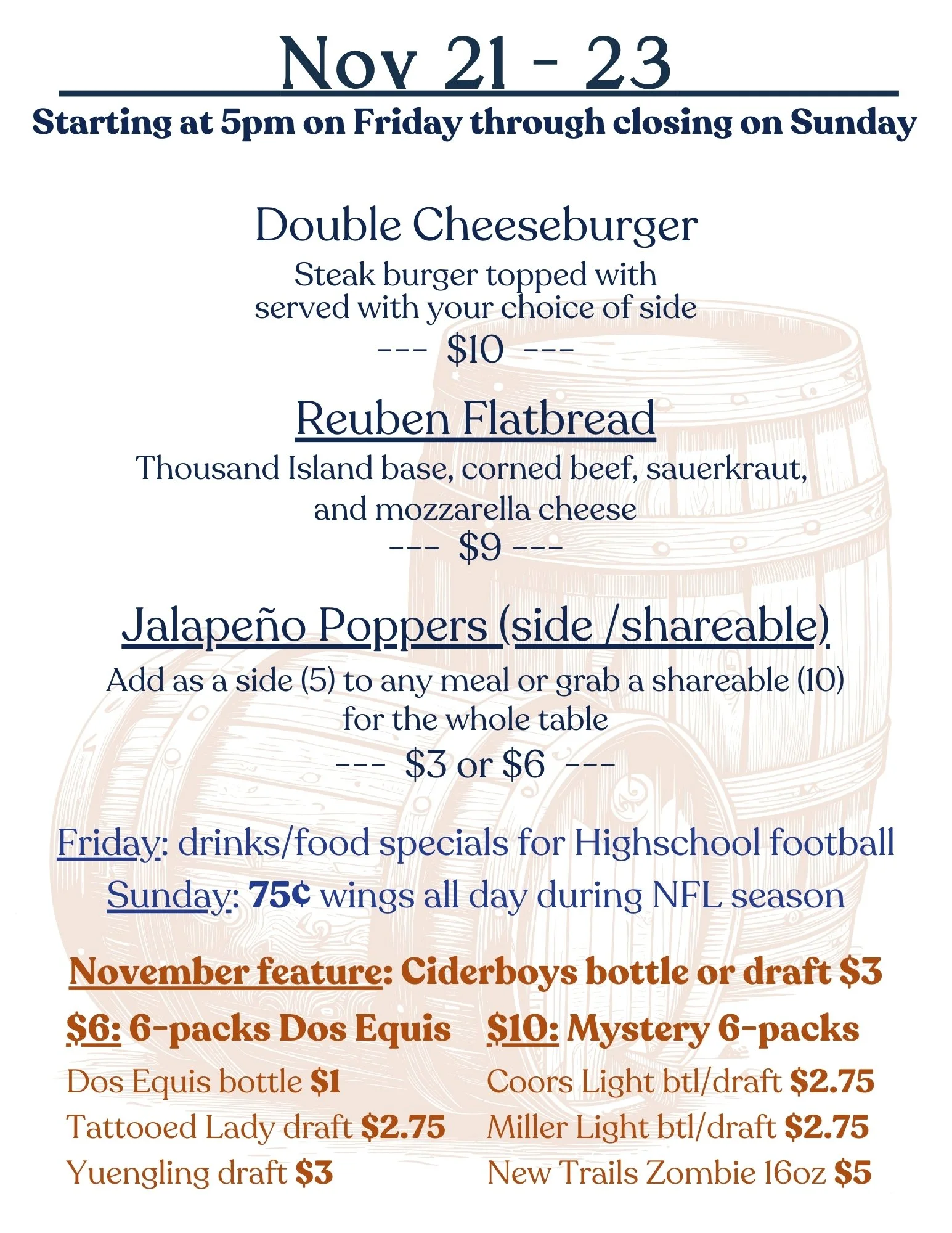 We have a variety of rotating lunch specials on Monday through Friday and dinner specials Friday through Sunday. Everything from homemade from heirloom recipes and family favorites, to hand-pressed steakburgers and seasonal salads.