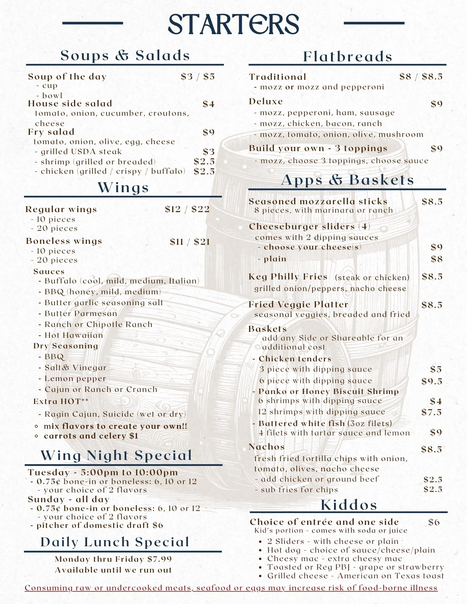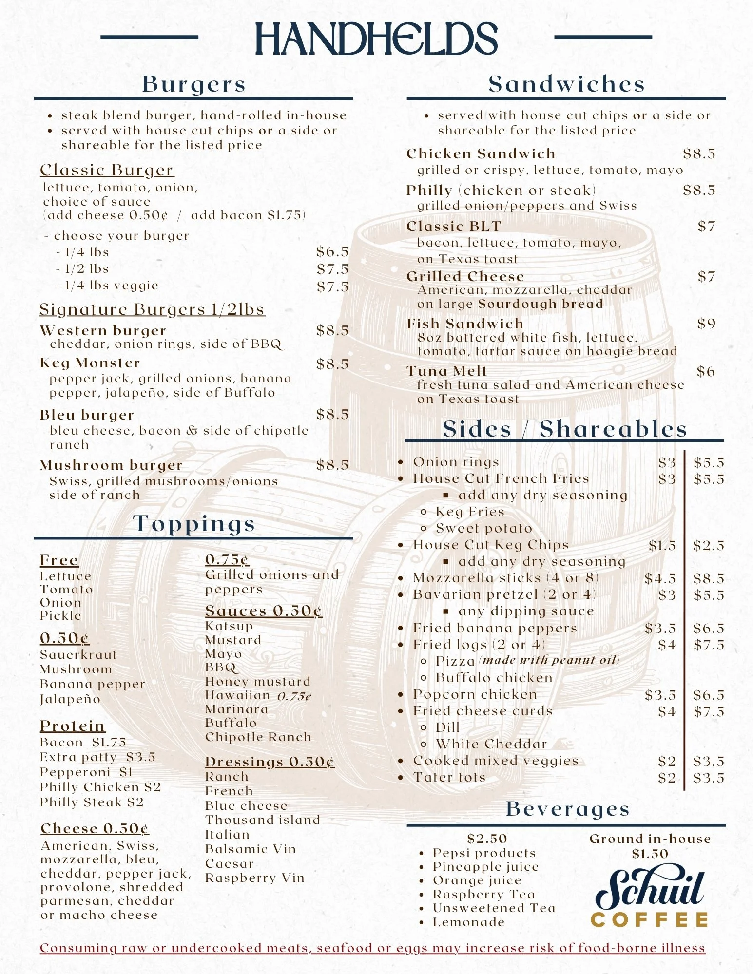 Food and Beverages See our Keg staples served daily Click or tap the images below to view Starters Handhelds Beverages New Brews Welcoming Spring with Orr’s Brewing Company from Titusville PA. Featuring a Baltic Porter and Centennial IPA!